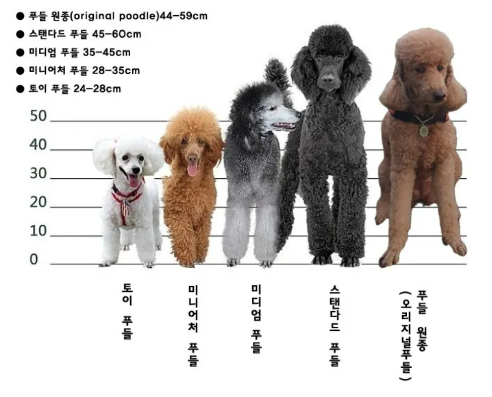 푸들은 여러 종류가 있지만, 이번 글에서는 크기에 따라서 크게 토이 푸들, 미니어처 푸들, 스탠다드 푸들로 크게 3종류로 나눌 수 있습니다.